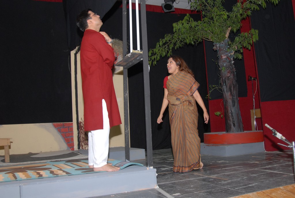গুগল করে দেখা গেল বহুরূপীর পাগলা ঘোড়া নাটকে খালেদ চৌধুরীর স্টেজ একেবারে authentic শ্মশান ! বাঁশ আর খড় দিয়ে তৈরী একচালা ঘর, দেয়ালে চাটাই আর মাদুর, টিমটিম করে লন্ঠনের আলো জ্বলছে। বাইরে একটা ফাঁকা জায়গা, এক পাশে গাছের তলায় একটা বেদী আর অন্য দিকে জ্বলন্ত চিতা।