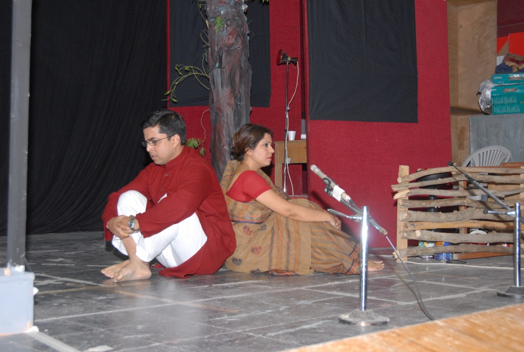 অমিতেন্দ্র আলোর সরঞ্জাম নিয়ে দরকার মত আলো জ্বালাচ্ছে নেবাচ্ছে, আর আমার অন্য পাশে পার্থ, তার কাজ হল ঠিক সময়ে Audio clip গুলো play করা। শ্মশানের রাত বোঝাতে ঝিঁঝিঁ পোকা আর শেয়াল কুকুরের ডাক, দূরে রেলগাড়ীর হুইসিল, এই সব ক্লিপ সে যোগাড় করে সি ডি তে রেকর্ড করে নিয়ে এসেছে। আমি বসে আছি ওদের দুজনের মাঝখানে।