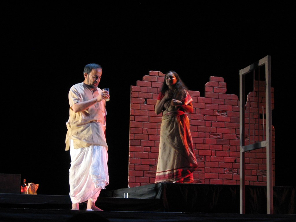 আবার USA র New Jersey তে অমল পালেকারের সাম্প্রতিক নাটকে স্টেজ হলো modern আর abstract, তাকে শ্মশান বলে বোঝার জো নেই। একটা ভাঙা চোরা লাল ইঁট বের করা দেয়াল, আর ঝকঝকে বিশাল স্টেজ জুড়ে চারটে নানা লেভেলের rectangular platform, এক একটা লেভেলে এক জনের flash back সীন, আর প্রত্যেক সীন আলাদা করে বোঝাবার জন্যে আলাদা রং এর আলো।