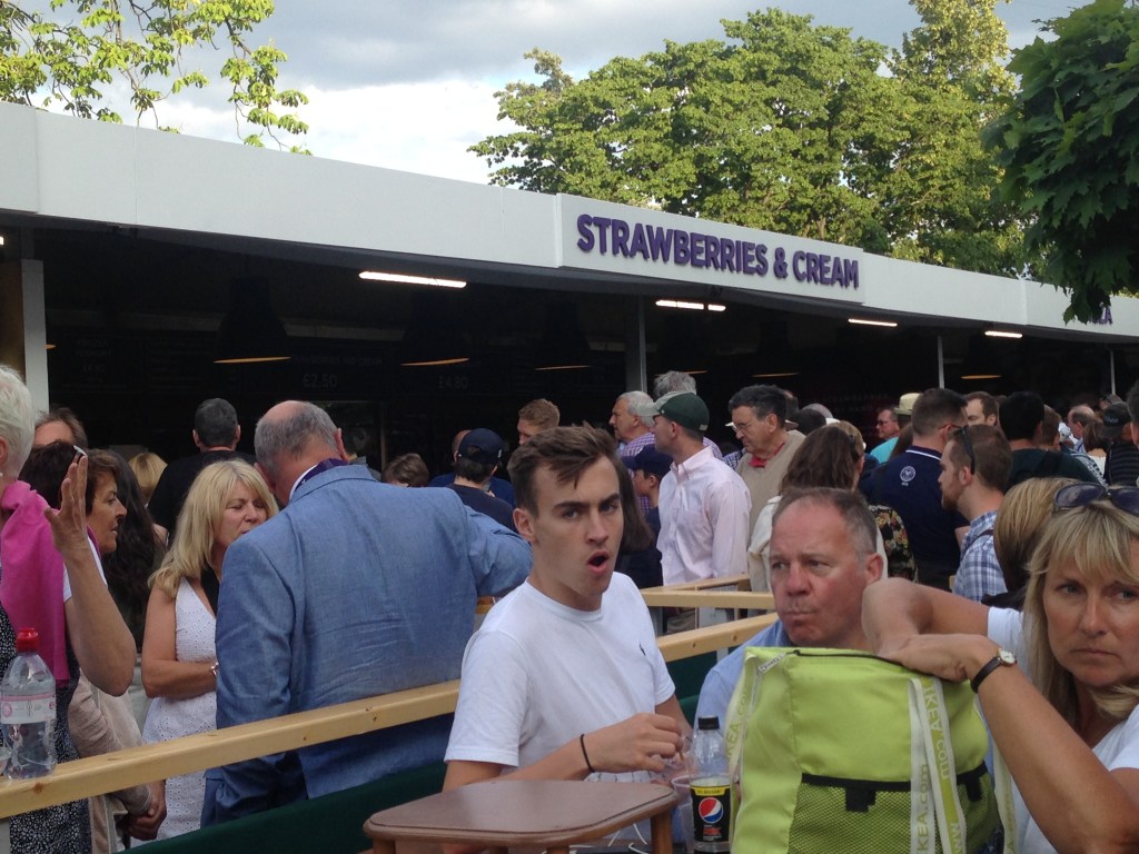 সামনেই  শ্যাম্পেন,  Pimms, Strawberry and cream, Pizza ইত্যাদির স্টল, সেখানে লম্বা লাইন।  আমরা সেন্টার কোর্টের গেট সন্ধান করে জেনে নিয়ে কিছু ছবি তুলে লাইনে দাঁড়িয়ে স্যান্ডউইচ আর শ্যাম্পেন কিনে এক জায়গায় বসে খেয়ে নিলাম।
