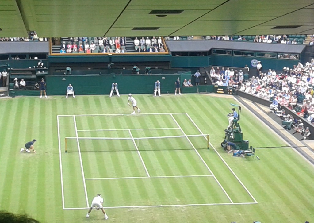 তবে সত্যি বলতে কি উইম্বলডনে ওই পাঁচ তলার ওপর থেকে খেলা দেখার থেকে বাড়ীতে আরাম করে টিভির সামনে বসে খেলা দেখার কোন তুলনাই হয়না।  প্রথমতঃ সেখানে কোর্টের সামনের সীটে বসে খেলা দেখার টিকিটের দাম আমার ধরাছোঁয়ার বাইরে। ভাগ্যে লটারীর শিকে ছিঁড়লে যা বুঝলাম ওই ওপর থেকেই খেলা দেখতে হবে।  আর বাড়ীতে বসে টিভিতে High resolution ক্যামেরার সৌজন্যে আমি ওই সামনে বসে থাকা গ্যালারীর দর্শকদের থেকেও অনেক বেশী কাছ থেকে খেলা দেখছি বলে মনে হয়। খেলোয়াড়দের যেন হাত বাড়ালেই ছোঁয়া যাবে, তাদের মুখের অভিব্যক্তি – ব্যর্থতার গ্লানি কিংবা সাফল্যের আনন্দ – স্পিনে বল কেমন ঘুরছে, ঘাসে বল পড়লে ধূলো উড়ছে, এই সব পরিস্কার দেখতে পাই।