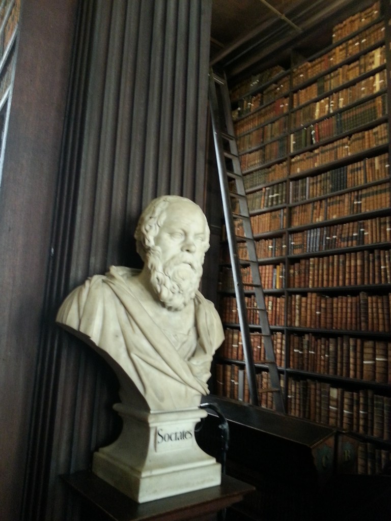 Long Room এর বিশাল হলঘর, উঁচু গোলার্ধ ছাদ (vaulted ceiling), মেঝে থেকে ছাদ পর্য্যন্ত ঠাসা বই এর র্যাক, সেখানে প্রায় ২০০,০০০ পুরনো বই পুঁথি আর পান্ডুলিপির সম্ভার, থরে থরে সাজানো। আর প্রায় একশো জন মনীষী দের marble bust, সাজানো রয়েছে গ্রন্থাগারের চারিদিকে – তার মধ্যে আছেন প্লেটো, সক্রেটিস, সেনাকা, আরিস্টট্ ইউরিপিডিস থেকে শুরু করে অপেক্ষাকৃত আধুনিক মনীষীরা – নিউটন, ডারউইন, শেক্সপিয়ার। ভেতরে ঢুকে গা বেশ ছমছম করছিল।