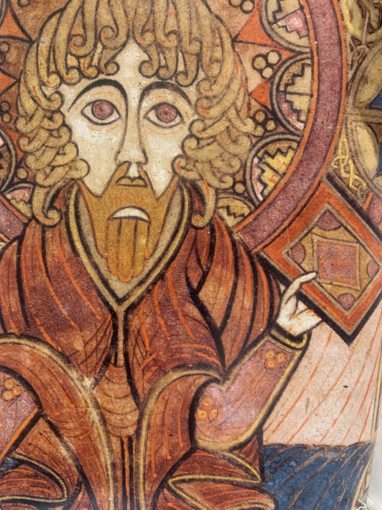 Exhibition এ জানানো হয়েছে কারা এই গসপেল গুলো লিখেছে, কি কাগজে লিখেছে, কি তুলি আর রং ব্যবহার করেছে এই সব। চারটি বাঁধানো Volume এ সব মিলিয়ে প্রায় ৭০০ পাতার এই বইটির প্রতিটি পাতা ১৩ ইঞ্চি x ১০ ইঞ্চি সাইজের off white রংএর calf vellum দিয়ে তৈরী কাগজে। লেখার calligraphy বড় দৃষ্টিমধুর, Font এর কিছুটা আঁকা বাঁকা ornate swirling দৃষ্টি আকর্ষন করে। সারা বই তে অনেক ছবি – মানুষ, জন্তু জানোয়ার আর mythical beast রা সেই সব ছবিতে সজীব vibrant রং এর ব্যবহারে যেন জীবন্ত হয়ে উঠেছে।